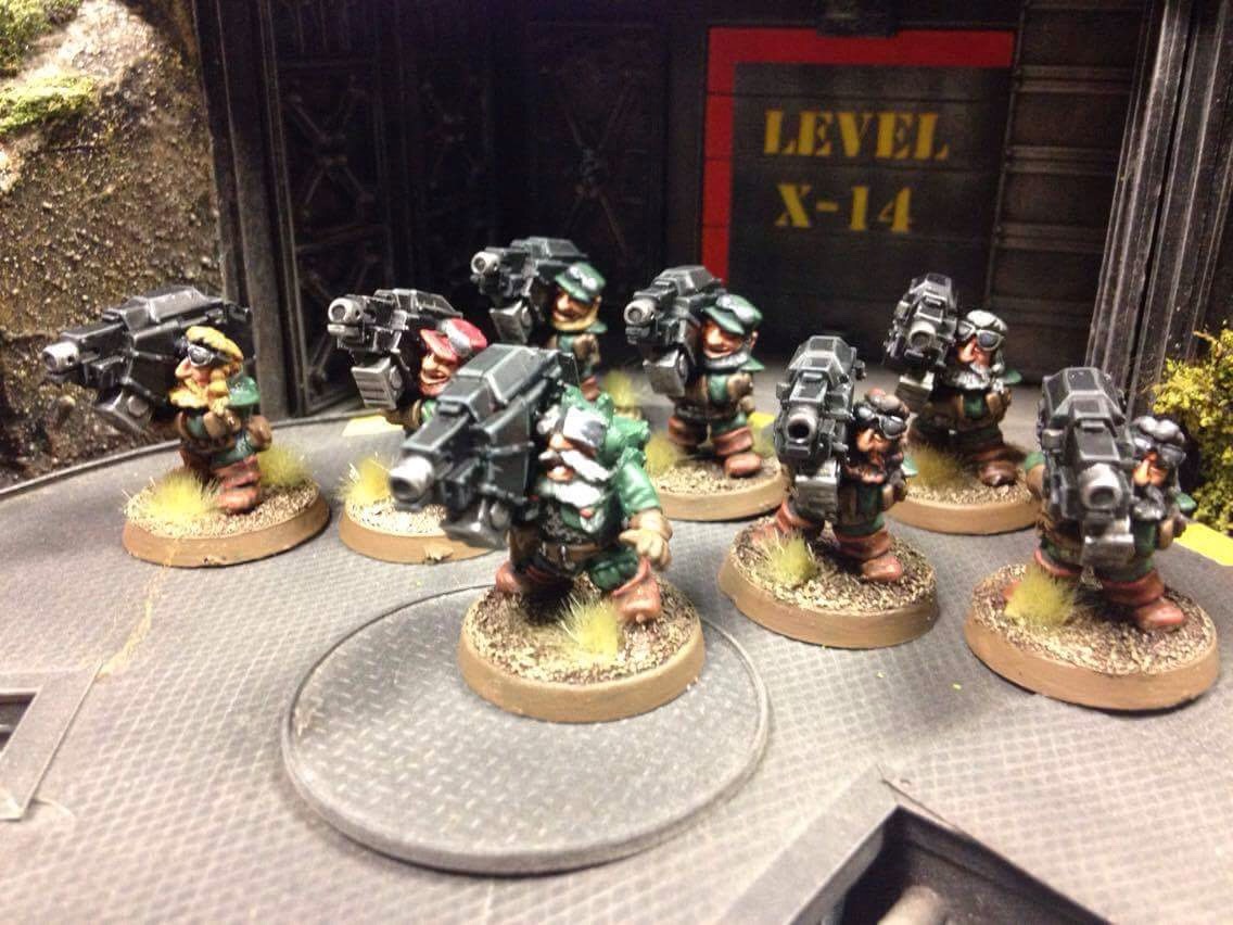 Hi all - inspired by the fact that the Warhammer World New Year Open Day will soon be upon us, and that for the last few years I've been asked to display my old school Rogue Trader collection there, I've been revisiting my Squats so I have something new to show off. Here's a Combat Team, equipped entirely with heavy bolters, something Squats were uniquely able to do in their White Dwarf army list. Technically the squad leader shouldn't have a heavy bolter too, but I'll redistribute models between squads for games anyway.