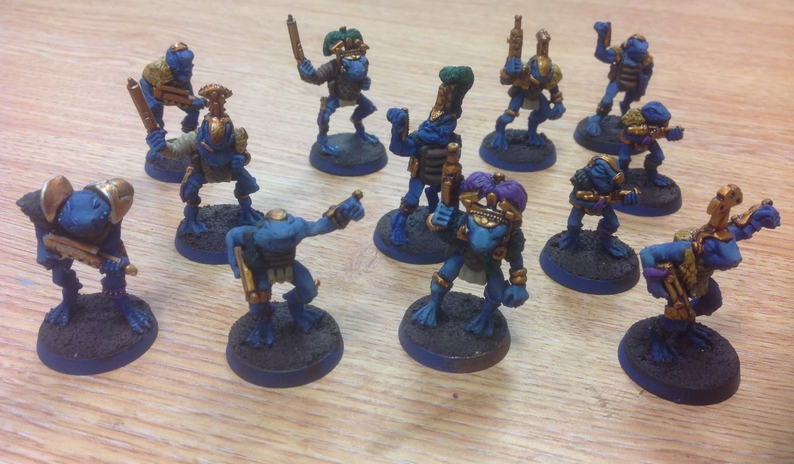 Just a quick shot of a project that got half done a year or so back and has resurfaced (like such half finished hobby projects tend to). This is a work in progress shot of a set of Space Slann. I have all thirteen of the original twelve Space Slann (nudge nudge wink wink) already painted green, so I'm painting this second set blue so they can mingle and minimise the effect of the duplicates. If I'm lucky enough ever to start a third set maybe they'll be yellow!